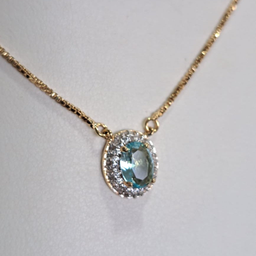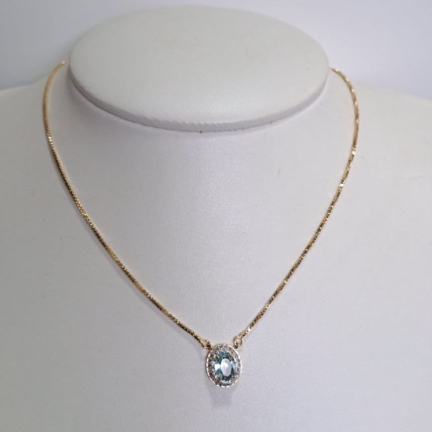 Colar em água marinha com design clássico e elegante. A água marinha é uma gema natural apreciada por sua tonalidade azul-celeste serena e propriedades energéticas reconhecidas. Este colar combina a beleza do cristal com acabamento refinado, ideal para quem busca uma peça versátil que complementa tanto looks casuais quanto sofisticados. A água marinha é conhecida por transmitir calma e clareza, tornando-a uma escolha significativa para uso diário ou ocasiões especiais.