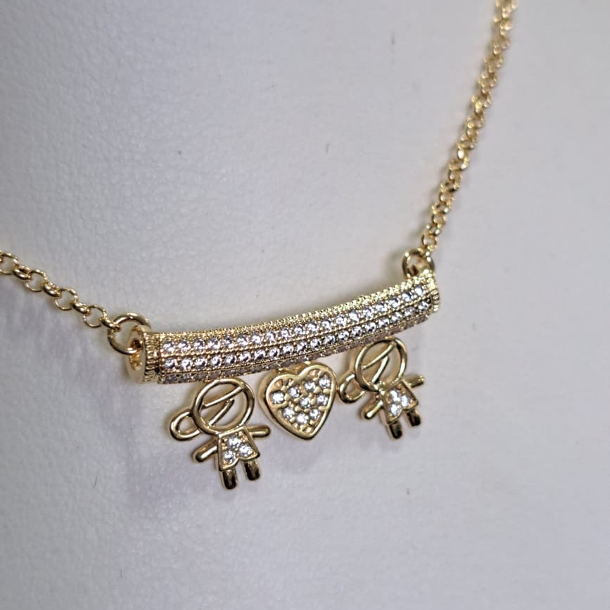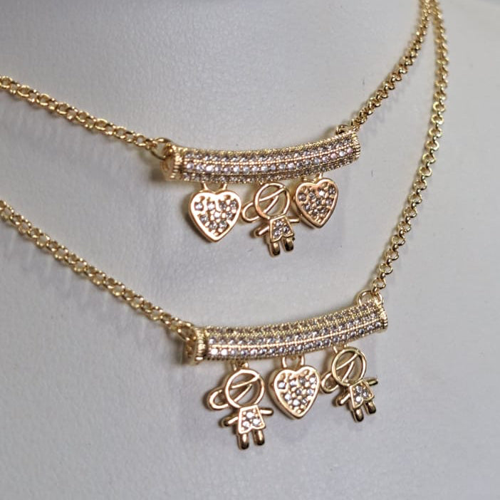 Colar delicado em ouro com pingentes personalizados representando dois filhos meninos. Peça versátil que combina elegância e significado emocional, perfeita para mães que desejam carregar a memória de seus filhos sempre perto do coração. O design refinado permite uso diário, enquanto os detalhes em ouro garantem durabilidade e brilho duradouro. Uma escolha sofisticada para quem valoriza joias com propósito e sentimento.