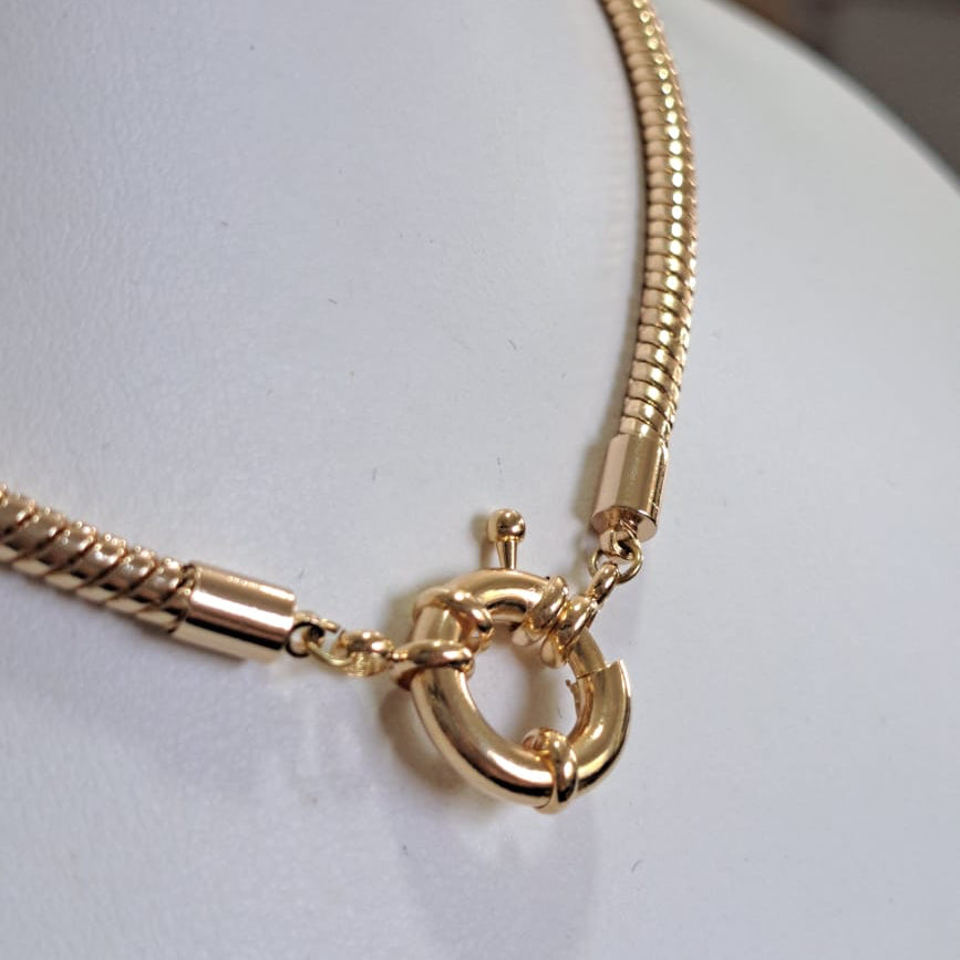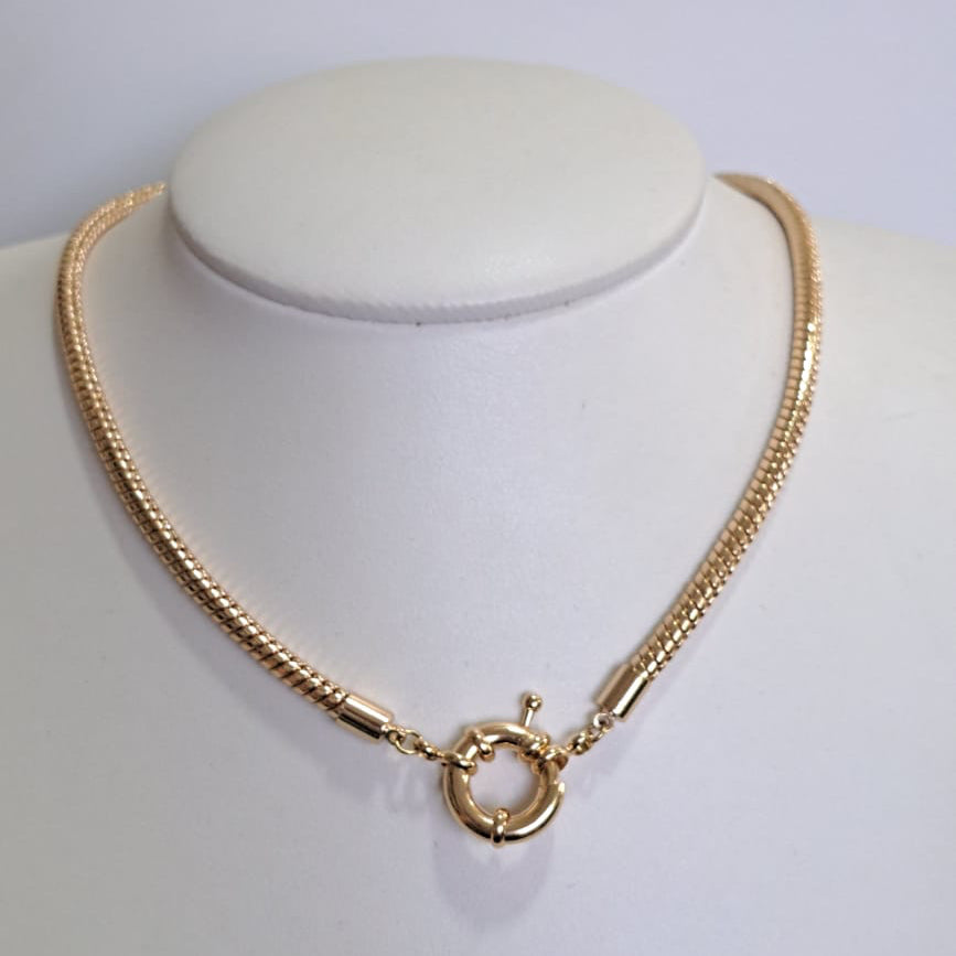 Colar em ouro com design sofisticado, apresentando corrente ravo de rato em espessura grande que garante durabilidade e presença marcante. O fecho tipo boia oferece segurança confiável para uso diário, enquanto o acabamento em ouro CD proporciona brilho duradouro e resistência ao desgaste. Peça versátil que combina elegância clássica com funcionalidade, ideal para quem busca uma joia de qualidade que acompanha diferentes estilos e ocasiões.